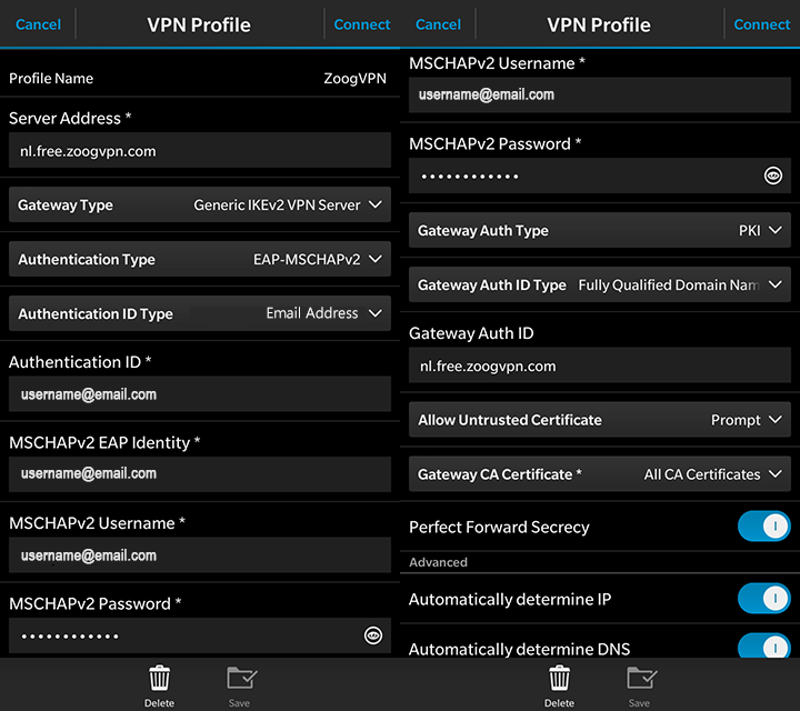 This setup guide shows how you can manually configure and connect to Zoog VPN servers from a Blackberry device using IKEv2.
