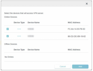 8. Select and add devices that will have access to the VPN server you configured and save the settings.